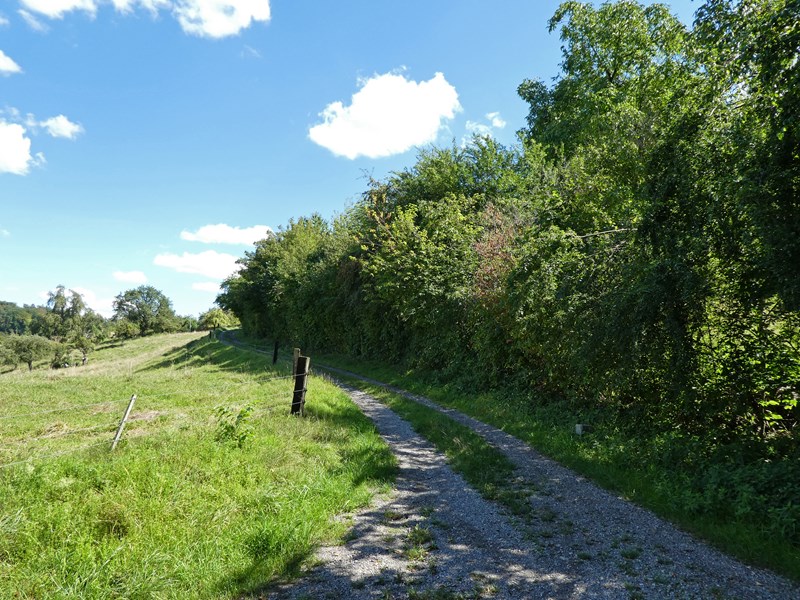 An der Schlossstrasse legten wir 2005 eine zweite Hecke an. Sie begrenzt die so genannte Schlosswiese beim Stall im Süden. 2017 wurde diese Hecke mit Unterstützung von Birdlife Schweiz um ca. 2 m verbreitert, um unserem Geflügel auf dieser Wiese, sowie wilden Tieren wie Igeln und Vögeln mehr Versteckmöglichkeiten zu bieten.
