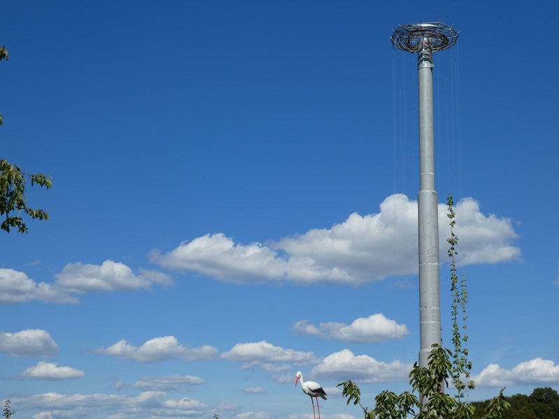Seit dem Frühling 2018 stehen zwei grosse Masten mit Plattformen auf dem BungertHof nahe der Greifvogelstation. Wir möchten, dass der Storch zurückkommt! Dieses Ziel verfolgt die Greifvogelstation schon seit einigen Jahren. Mehrmals schon machten Störche im Frühling auf dem Durchzug Zwischenhalt bei uns, aber noch blieb keiner… Letztes Jahr und diesen Sommer bekamen wir Jungstörche zur Aufzucht, die bei Stürmen aus dem Nest fielen.