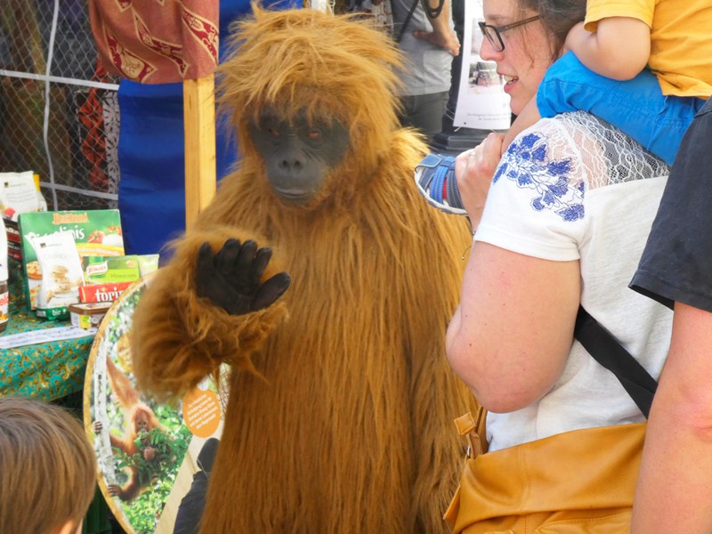 An Afro-Pfingsten wurden viele Besucher durch einen Orang-Utan (Waldmensch auf Indonesisch) überrascht, der auf seine Weise Gross und Klein auf die Probleme der Zerstörung seines Lebensraums aufmerksam machte. Sumatras tropische Regenwälder werden vor allem wegen der explosiven Ausbreitung der Palmöl-Plantagen rasant zerstört.