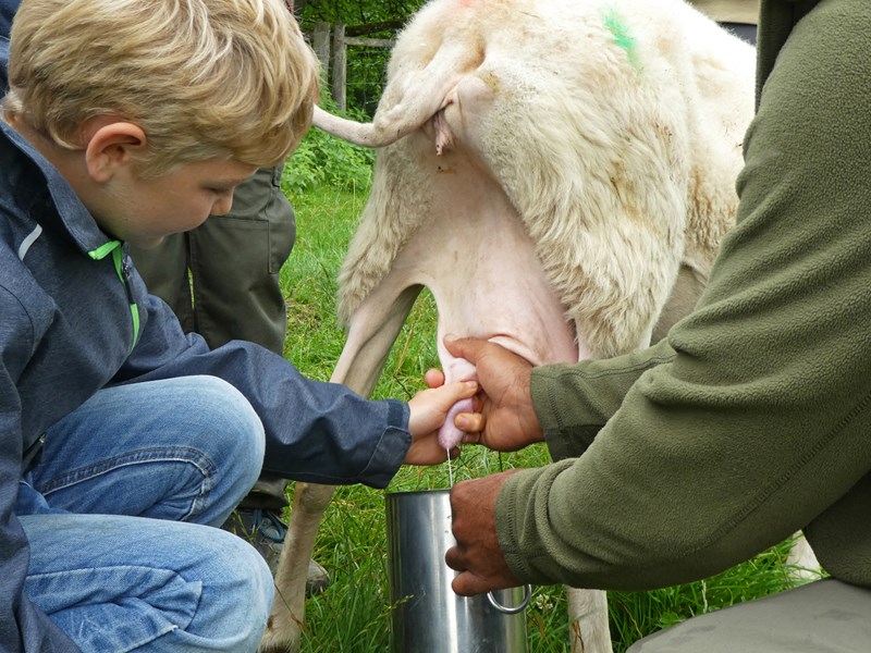 … und dazu noch selber gemolken. Eine interessante Erfahrung für eine Schar aufgeweckter Kinder beim Erlebnistag auf dem BungertHof.
